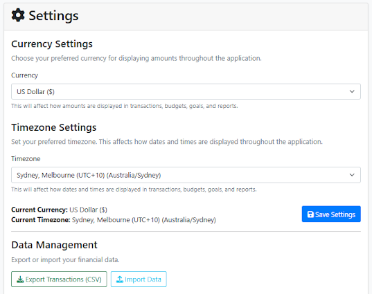 - Profile Management: Update personal information, currency, and timezone preferences