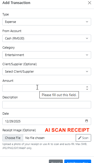EASY ADD TRANSACTION WITH AI SCAN RECEIPT